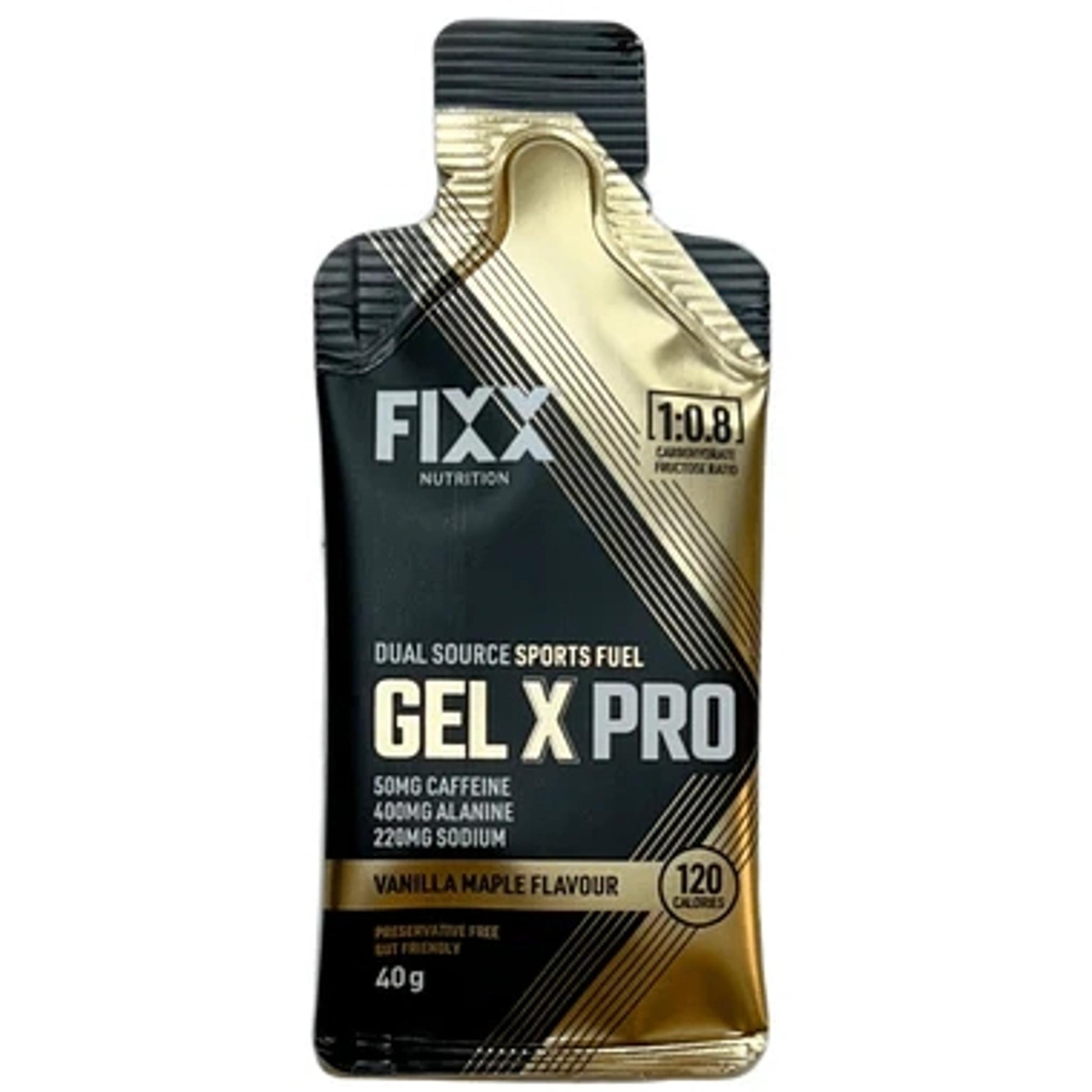 FIXX Gel X PRO Energy Gel 40g Vanilla Maple is a gut friendly, dual-source carbohydrate gel delivering 120 calories and 29.3g of fast-absorbing fuel per sachet, plus electrolytes and amino acids to support performance and reduce stomach discomfort. Made from simple ingredients, preservative free and vegan, it provides efficient energy, electrolyte replenishment and a touch of caffeine to boost focus during training or racing.
