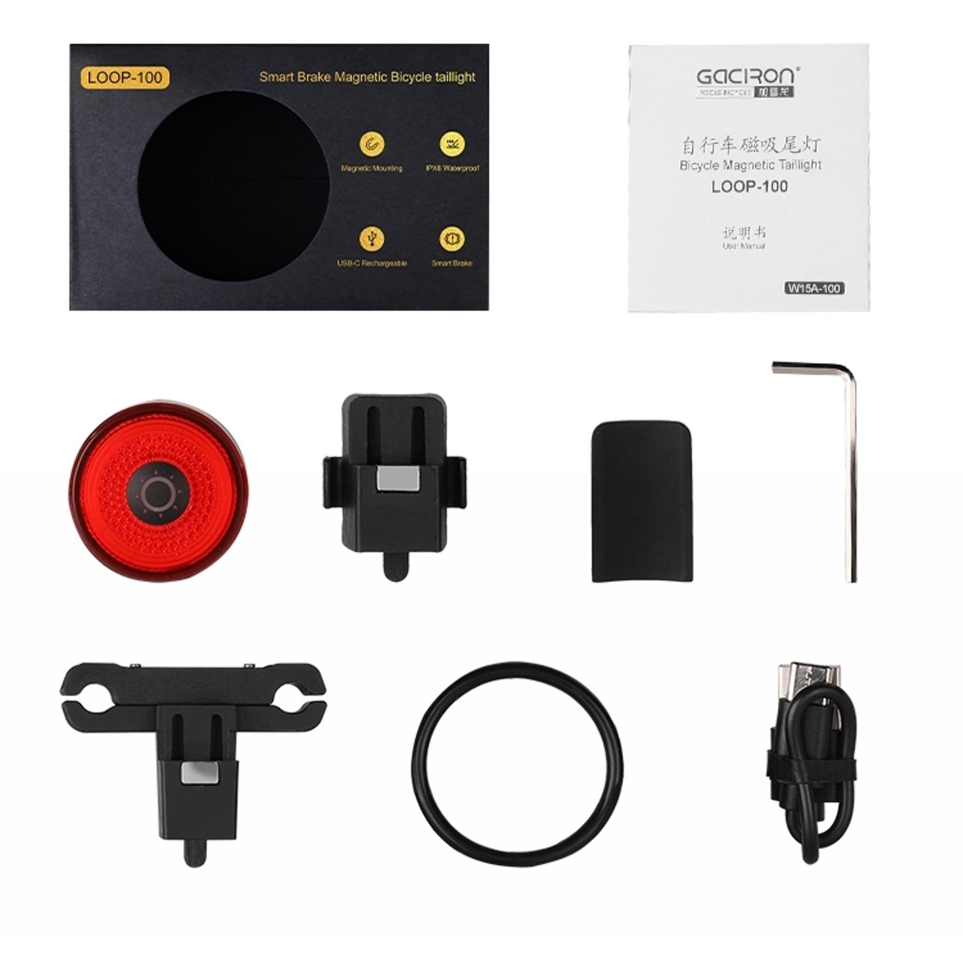 The Gaciron 100 LM Smart Brake 100 Lumens Magnetic Rear Light is a compact, durable taillight with a secure magnetic mount, precision brake-sensing technology, and a wide-angle Fresnel lens for 220° visibility; it includes a long-lasting 420mAh rechargeable battery, CNC aluminum housing, IPX6 water resistance, and convenient saddle and seatpost mounting for safer rides in varied conditions.